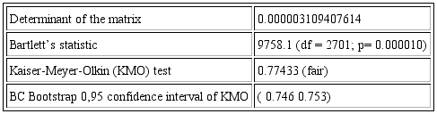 De acuerdo con la tabla 2 el índice KMO con una puntuación de 0,77433 y la prueba de Bartlet (p=0.000010) concluyen que es posible realizar el análisis factorial.