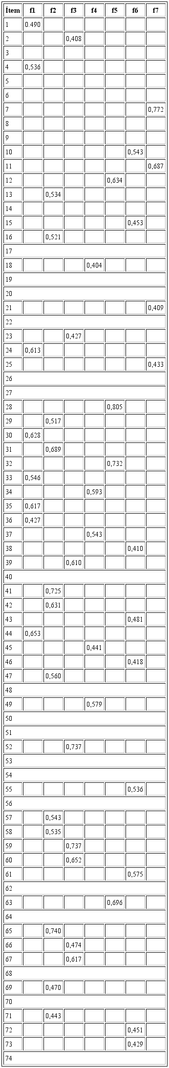 La tabla 3. presenta las correlaciones tetracóricas sugiriendo la implementación de 7 factores. La tabla 4. la matriz de componentes rotados Varimax. En este apartado tomamos como criterio los valores superiores a 0.40 como cargas factoriales que le aportan al factor. Se observa que el factor 1 quedó conformado por los ítems: 1, 4, 24, 30, 33, 35, 36 y 44. El factor 2: 12, 16, 29, 31, 41, 42, 47, 57, 58, 65, 69 y 71. El factor 3: 2, 23, 39, 52, 66 y 67. El factor 4: 18, 34, 37, 45, 49, 59 y 60. El factor 5: 12, 28, 32 y 63. El factor 6: 10, 15, 39, 43, 46, 55, 61, 72 y 73. Y finalmente, el factor 7: 7, 11, 21 y 25. Este último factor corresponde a preguntas que tienen saturación negativa.