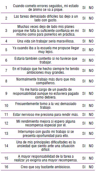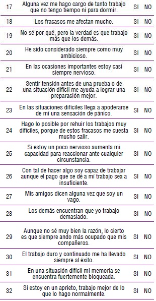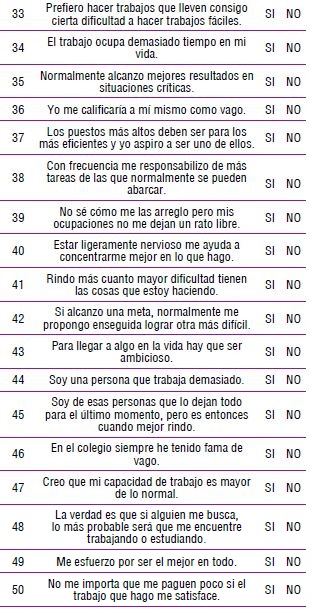 El factor alta capacidad de trabajo y rendimiento que originalmente estaba conformado por 15 ítems en la versión adaptada queda conformada por 12 ítems. El factor denominado Vagancia que originalmente estaba conformado con 12 ítems queda en la versión adaptada con 6 ítems. El factor denominado ansiedad facilitadora del rendimiento que originalmente estaba conformada por 12 ítems, en la versión adaptada queda conformado por 7 ítems. El factor ambición que originalmente estaba conformado por 13 ítems, queda conformado en la versión adapta de por 4 ítems. El factor motivación intrínseca que estaba conformado por 16 ítems, queda en la versión adaptada con 13 ítems de los cuales 9 son positivos y los 4 ítems restantes son con saturación negativa convirtiéndose en el último factor sugerido por el análisis factorial.