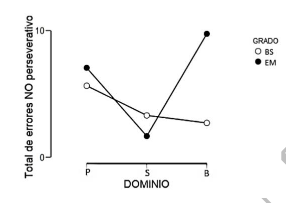 Posteriormente, en la comparación nivel de proficiencia-nivel educativo se encontraron las siguientes diferencias significativas: p.0.036 en ENP y p.0.012 en TE de la prueba M-WCST, como se observa en las figuras 2 y 3, los niveles de proficiencia P y S de ambos niveles educativos obtienen promedios semejantes, sin embargo, los estudiantes con nivel de proficiencia B dan cuenta de una menor comisión de errores cuando pertenecen a BS que a EM.