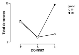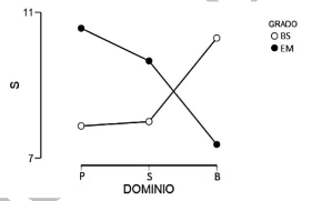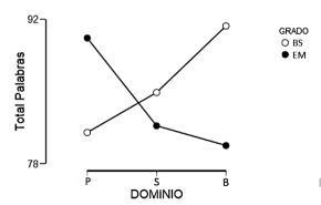En la prueba Stroop se encontró una diferencia significativa en P de 0.026; en el caso del grupo de BS se observó que los estudiantes producen un mayor número de elementos a medida que mejora su nivel de proficiencia con la segunda lengua, mientras que el grupo de EM obtiene resultados inversos a los descritos (véase figura 4). Finalmente, se encontró un p.0.010 en la categoría S de la prueba Fluidez Verbal Fonológica y Semántica; en la figura 5 se puede observar que las diferencias de medias entre los niveles de proficiencia de un nivel educativo y el otro son opuestas. La producción de palabras en los grupos P y S de cada nivel educativo es medianamente cercana; sin embargo, respecto al grupo B, los resultados se incrementan de forma considerable en los estudiantes de BS y decrecen en el grupo de EM.