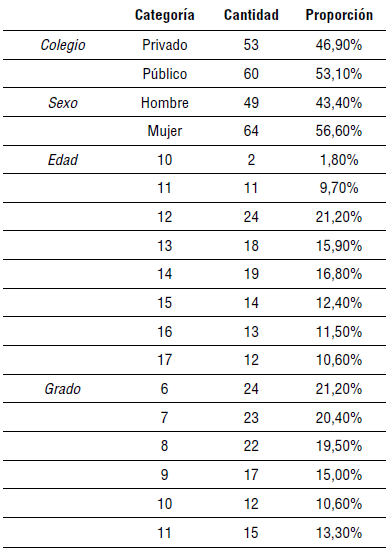 La selección de los participantes se determinó a través de un muestreo no probabilístico por conveniencia que permitió la inclusión de 113 niños con nivel de escolaridad secundaria de la ciudad de Bogotá. Los criterios de inclusión fueron: (a) ser estudiantes activos de las instituciones seleccionadas y estar cursando algún grado de secundaria; (b) tener entre 10 y 17 años de edad durante la aplicación de las pruebas; (c) tener como lengua materna el español; (d) no presentar limitaciones físicas, cognitivas, perceptivas, visuales, auditivas o motoras que limitaran la ejecución de las pruebas; (e) no presentar antecedentes de historial médico con enfermedades que comprometan el sistema nervioso central y se asocie con posibles déficits neuropsicológicos, ni abuso de alcohol u otras sustancias psicotrópicas; (f) no reportar consumo de sustancias psicoactivas en los seis meses previos a su participación en el estudio; (g) contar con la firma del consentimiento informado por parte de los padres y querer participar de forma voluntaria.