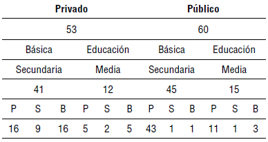 La muestra de participantes fue organizada según los siguientes criterios: tipo de colegio (privado o público), nivel educativo Básica Secundaria (BS) de 6º a 9º grado y Educación Media (EM) de 10º a 11º grado; dicha división corresponde a las normas del Ministerio de Educación Nacional (MEN) respecto a los niveles de educación formal en el país. Del mismo modo, la muestra se organizó de acuerdo al nivel de proficiencia del segundo idioma a partir de los criterios de proficiencia percibidos por los padres de cada uno de los participantes: Pobre (P), hace referencia a aquellos estudiantes que usan el segundo idioma únicamente en el contexto del colegio regular; Suficiente (S), estudiantes que poseen una competencia de dominio superior pero su fluidez no es sobresaliente; Bueno (B), estudiantes que tienen un dominio más elevado de comprensión y habla, su fluidez y necesidad de uso de segundo idioma es mayor.