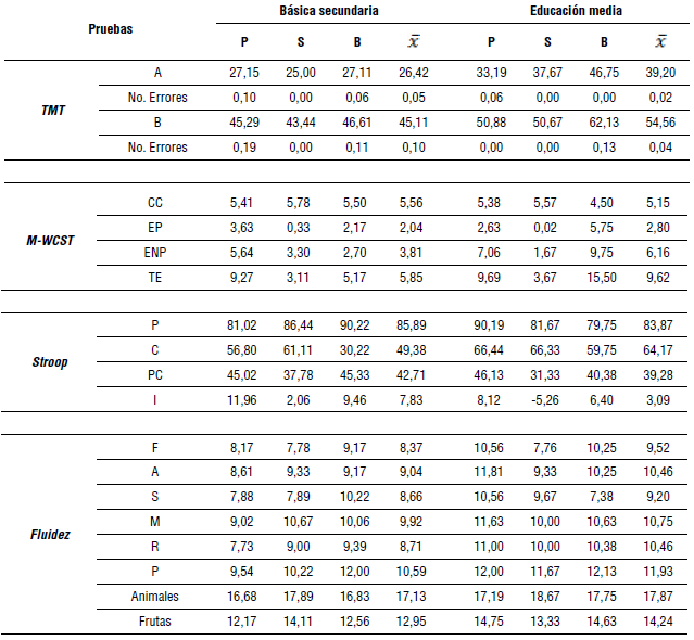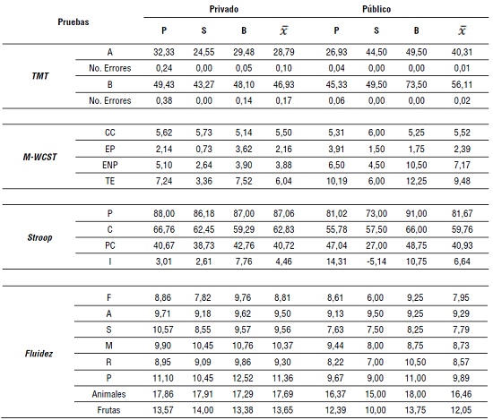 Por otro lado, las pruebas de evaluación de la flexibilidad mental, TMT y M-WCST, indican un desempeño muy cercano entre los estudiantes de ambos colegios, el público y el privado. Sin embargo, se observaron diferencias en virtud del nivel educativo en categorías particulares de dichas pruebas, por ejemplo, en la prueba TMT los estudiantes de educación media cometieron menos errores; mientras que el número de errores en la prueba M-WCST fue más alta en el caso de los niños de básica secundaria.