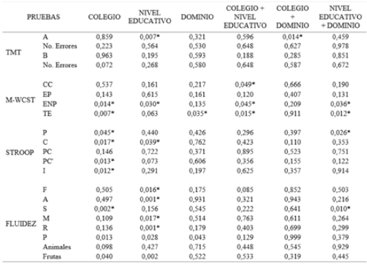 Tras la consolidación de los estadísticos descriptivos, los demás resultados fueron procesados con la ayuda del paquete estadístico JASP 0.9.0.1; dado el tamaño de la muestra se utilizó la técnica estadística de análisis de varianza unifactorial (ANOVA) con significancia de p<.05, los resultado de este ejercicio se pueden consultar en la tabla 5. En dicha tabla se evidencia un mejor rendimiento en la ejecución de las pruebas por parte del grupo de participantes del colegio privado, particularmente notorio en las pruebas M-WCST, Stroop y Fluidez Verbal; grupo dentro del cual los estudiantes de nivel educativo de básica secundaria (BS) obtuvieron puntajes superiores al grupo del nivel de educación media. En la tabla 3 se presentan los resultados en cada una de las pruebas y el rendimiento de cada grupo. A continuación de la tabla, se presenta un análisis de lo observado en cada una de las pruebas.