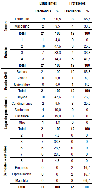 En la muestra de docentes, las caracteristicas sociodemográficas develan que el 33% corresponde a hombres y el 67% a mujeres. El estrato socioeconómico oscila entre dos y cuatro. El 83% de los docentes son solteros. Los docentes son procedentes de Cundinamarca y Boyacá. Un 67% de los maestros tienen un nivel de estudios de maestría.