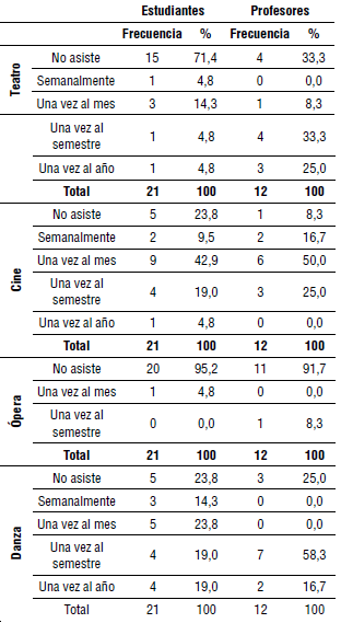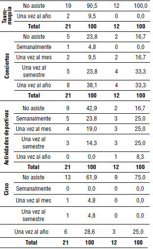 El tipo de prácticas culturales que son más consumidas por los docentes, es también el cine, que tiene la frecuencia más alta, pues la realizan semanal, mensual y semestralmente. Por su parte, la asistencia a conciertos, teatro, danza, es semestral. La participación en deportes es semanal, mensual y semestral regularmente. Mientras que el tipo de consumo cultural al que menos asisten es al circo, con frecuencia anual. Se evidencia una reducida asistencia a ópera, y un nulo consumo de tauromaquia. La tabla 2 muestra estos resultados obtenidos.