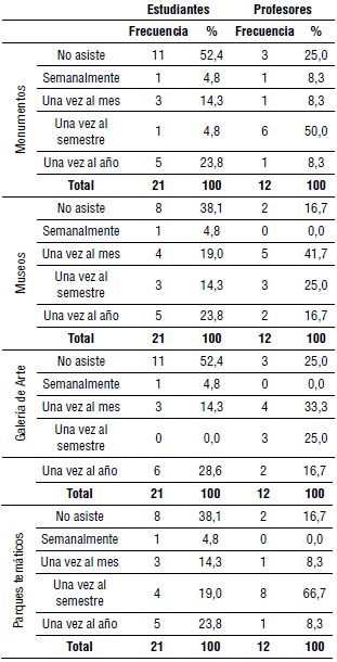 En cuanto a esta misma categoría de consumo, en el caso de los docentes, se registra mayor asistencia a museos y a parques temáticos, seguido por monumentos, el cual tiene un nivel de frecuencia semestral. Se presenta una muy baja asistencia a galerías de arte. Como se expone en la tabla 3.
