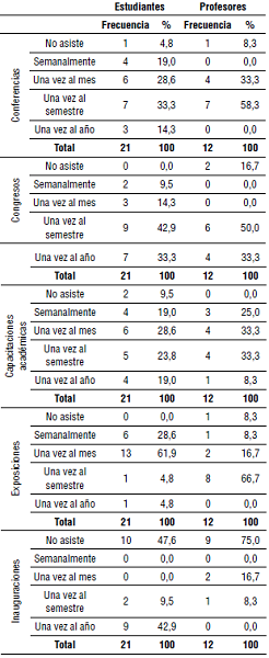 En cuanto al consumo cultural de actividades académicas en estudiantes el mayor nivel de asistencia es a congresos, exposiciones y capacitaciones los cuales realizan con una frecuencia mensual y semestral. A inauguraciones, la asistencia es baja y la realizan anualmente.