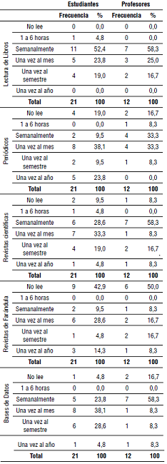 En lo referente a consumo cultural de lectura en estudiantes, el mayor está en la lectura de libros y revistas científicas, los cuales hacen semanalmente. En cuanto al consumo de periódicos y bases de datos, el nivel de frecuencia es mensual. Las razones por las cuales lo consumen son con fines académicos y por obtener información. Se presenta baja lectura de revistas de farándula.