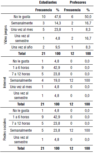 En lo concerniente a los docentes, el consumo cultural de tecnologías se concentra en mayor proporción en la internet con el uso de las redes sociales, el e-mail, WhatsApp, que tiene una frecuencia de entre 1 y 6 horas diarias. El tipo de consumo menos frecuente son los videojuegos, blogs y youtubers. En lo relacionado al consumo cultural de telefonía celular y computador es alta presenta una frecuencia de consumo de entre 1y 6 horas diarias.