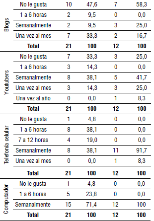 En cuanto a la categoría consumo cultural de tecnologías como internet, redes sociales, telefonía y computador, se evidencia un nivel de frecuencia diaria, seguido por estos están los youtubers y en menor frecuencia videojuegos y blogs, tanto en estudiantes como en docentes.
