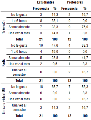Las razones principales por las cuales realizan estas actividades son por interés social, gratuito y académico. Por otro lado, se evidencia un bajo consumo de la emisora virtual de la Universidad de Boyacá tanto en docentes como en estudiantes. Cuyos resultados se muestran en la tabla 7.
