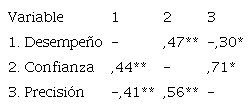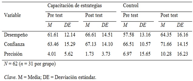 Las estadísticas descriptivas por grupo se presentan en la Tabla 2. Las Tablas 3 y 4 muestran la matriz de correlación bivariante de orden cero por grupo durante el pre test y el post test, respectivamente.