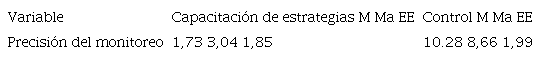 La precisión del monitoreo previo ejerció un efecto significativo en la precisión posterior, F(1,59) = 18,23, p < 0,001, η2p = 0,236, por lo que fue necesario controlar estadísticamente el efecto de la precisión del pre test. Después de controlar estadísticamente la precisión del monitoreo previo (es decir, eliminar su efecto), el tipo de condición (capacitación de estrategias cognitivas, control) afectó significativamente la precisión del monitoreo posterior, F(1,59) = 6,49, p = 0,019, η2p = 0,086, lo que indica un tamaño de efecto medio. Los datos con puntajes de precisión de monitoreo promedio ajustados del post test (controlando los puntajes de precisión del pretest) sugieren que el grupo expuesto a la capacitación de estrategias cognitivas exhibió una precisión de monitoreo significativamente mayor que aquellos en el grupo de control (ver Tabla 5 para los puntajes promedio de precisión de monitoreo ajustados en el post test).