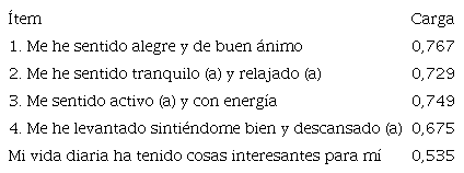 En el AFC, las cargas factoriales se hallaron entre 0,535 y 0,766, todos por encima de 0,500, valores deseables para análisis con muestras de más de 1.000 participantes. Estos valores de cargas factoriales suelen predecir buenos indicadores de ajuste entre los datos y el modelo teórico del constructo, es decir, corroborar la dimensionalidad propuesta. Adicionalmente, se presentaron en un rango relativamente estrecho, sin coeficiente en valores extremos cercanos a 1,00. Todas las comunalidades y coeficientes se presentan en la tabla 1. Los indicadores de bondad de ajuste del WHO-5 fueron: chi cuadrado=34,41; gl=5; p=0,001; RMSEA=0,063 (IC90% 0,044-0,084); CFI=0,988; TLI=0,975 y SRMR=0,018. Todos los indicadores con valores dentro de los rangos apropiados, con excepción de la prueba de chi cuadrado que es una prueba muy conservadora y sensible a los tamaños de muestra mayor de 200 participantes.