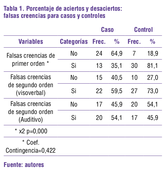 En la prueba de falsas creencias de primer orden solo el 35.1% de los participantes del grupo de casos fue capaz de hallar la respuesta acertada, en comparación con el 81.1% de los participantes del grupo control. En la prueba de falsas creencias de segundo orden (visuoverbal), la diferencia entre grupos se hizo más pequeña; en el grupo de casos el 59.5% de los participantes hallaron la respuesta correcta y en el grupo controles cerca del 73% de los participantes. En la prueba de falsas creencias de segundo orden (Auditiva), el grupo de casos tuvo mejor desempeño que el grupo control: en el grupo de casos, un 54.1% logró una respuesta acertada, mientras que en el grupo control logró acertar el 45.9%. Se evidencia que los niños con TDAH tiene mayor dificultad que los niños sin el trastorno para responder las pruebas de falsas creencias (Ver tabla 1).