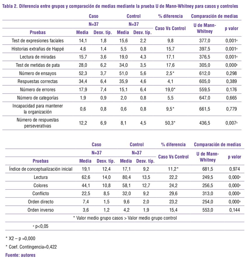En todas las pruebas de ToM, el grupo control logró un mejor desempeño que el grupo de casos, con diferencias estadísticamente significativas; el test de Metidas de pata, fue el que mayor diferencia porcentual presentó en la puntuación entre grupos. En cuanto a la comparación de medias, para todas las pruebas existen diferencias estadísticamente significativas entre casos y controles. En cuanto a las FES, el grupo control obtuvo mejor desempeño que el grupo casos en la mayoría de las pruebas, el número de respuestas perseverativas fue la que presentó mayor diferencia porcentual en la puntuación entre grupos. Al examinar la comparación de medias entre grupos, se encontró, además, que existen diferencias estadísticamente significativas entre casos y controles en el número de respuestas perseverativas, en todas las pruebas del Stroop test y en la puntuación de la prueba de dígitos en orden directo. Estos resultados demuestran que los niños con TDAH presentan dificultades en el desarrollo de las habilidades de cognición social relacionadas con la teoría de la mente y en las funciones ejecutivas (Ver tabla 2).