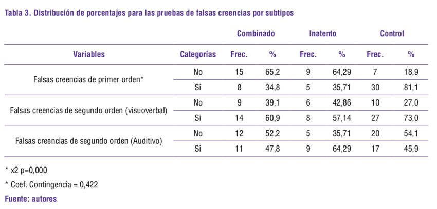 En la prueba de falsas creencias de primer orden, en el subtipo combinado, el 34.8% acertó la respuesta y en el subtipo inatento el 35.71%, en comparación con el 81.1 % de los participantes del grupo control. En la prueba de falsas creencias de segundo orden (visuoverbal), la diferencia entre grupos se hizo más pequeña, donde el 60.9% de los participantes del subtipo combinado y el 57.14% del subtipo inatento hallaron la respuesta acertada en comparación con el 73% de los participantes del grupo control. Por último, en la prueba de falsas creencias de segundo orden (Auditiva), el subtipo inatento obtuvo mejor desempeño que el subtipo combinado con aciertos del 64.29% y 47.8% respectivamente, frente al 45.9% del grupo control, que en este caso no superó el puntaje al grupo de niños con TDAH. Con lo anterior, se interpreta que el grupo de niños con TDAH del grupo inatento demuestran mejores habilidades para responder las falsas creencias de primer orden y las de segundo orden de tipo auditivo (Ver tabla 3)