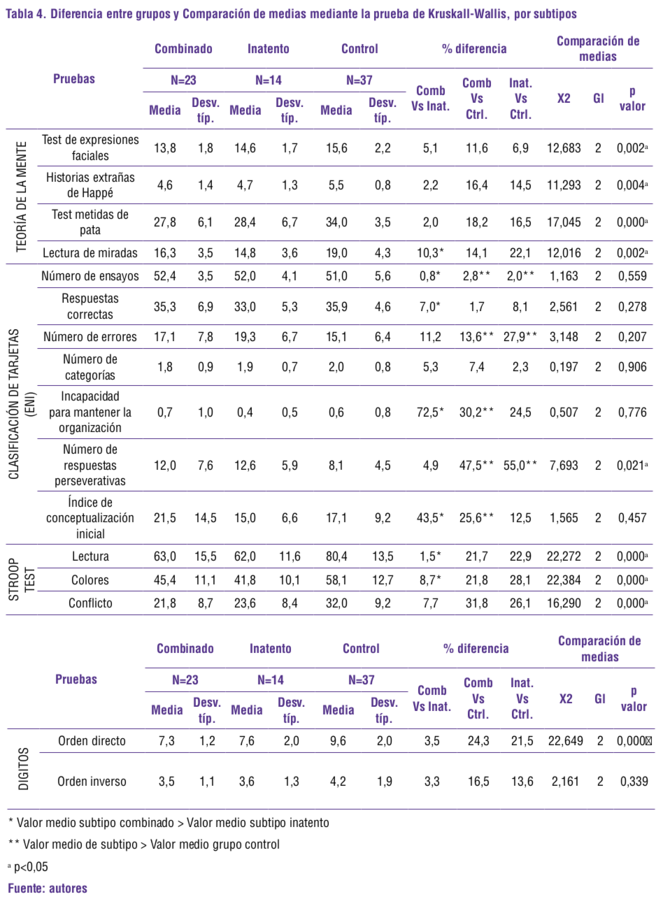 Los niños con TDAH presentaron desempeños más bajos en las pruebas de Funciones Ejecutivas evaluadas (flexibilidad cognitiva, toma de decisiones, conceptualización, atención, inhibición, velocidad de procesamiento y memoria operativa) que los del grupo control, lo cual era de esperarse debido a las características neuropsicológicas del trastorno. En las pruebas de ToM el subtipo inatento obtuvo mejor puntuación que el subtipo combinado a excepción de la prueba de Lectura de Miradas (aunque las diferencias no fueron significativas).