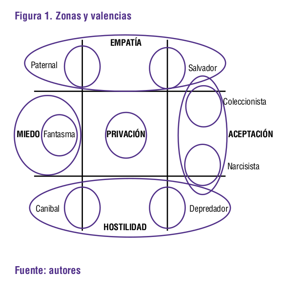 A continuación, se presentan los diagramas con sus respectivas estructuras previas relacionadas con las geometrías y sus dramáticas en la comisión de delitos sexuales (véase “Anexos”, esquema 1). En este esquema se ubican los ocho modos emocionales en zonas de atracción o repulsión. De atracción: se encuentran la zona empática y la zona vanus o de aceptación; y en la repulsión: las zonas de hostilidad, miedo o retraimiento. Como se demostró en la descripción y en el análisis, los diferentes conflictos sexualizados están anidados respectivamente en estas fuerzas emocionales.