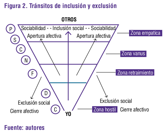 En los siguientes diagramas se visualizarán la dimensión temporal y la espacial. En la siguiente se expondrán los fundamentos espaciales respecto al plano socioafectivo con su respectiva inclusión o exclusión social; referidas estas al grado de sociabilidad en la actuación delictiva del victimario y el modo de consentimiento del acto sexual que estableció con la víctima. Cada uno de los dramas se ubica en una de las zonas a la que corresponde con base en el grado de inclusión o exclusión social (véase figura 2).