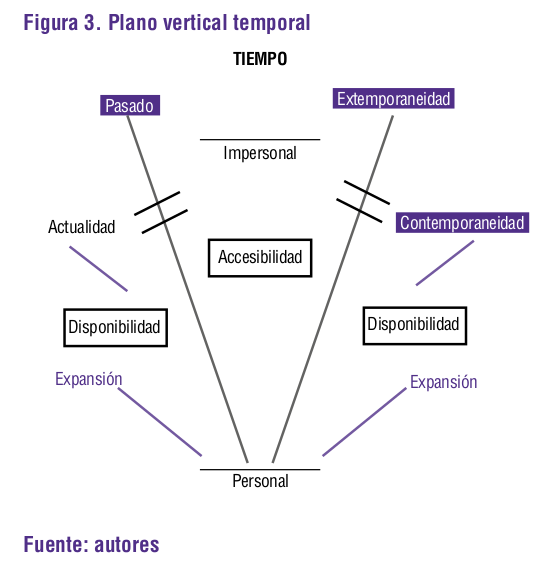 Respecto al tiempo y las geometrías de sus dramas se presentan dos diagramas: uno vertical y otro horizontal. El vertical hace referencia al primer factor: tiempo. El trazado temporal vertical denota el nivel personal e impersonal respecto al tiempo presente y el pasado, y su relación con la extemporaneidad versus contemporaneidad (véase esquema 3).