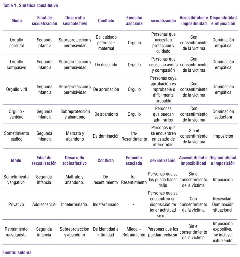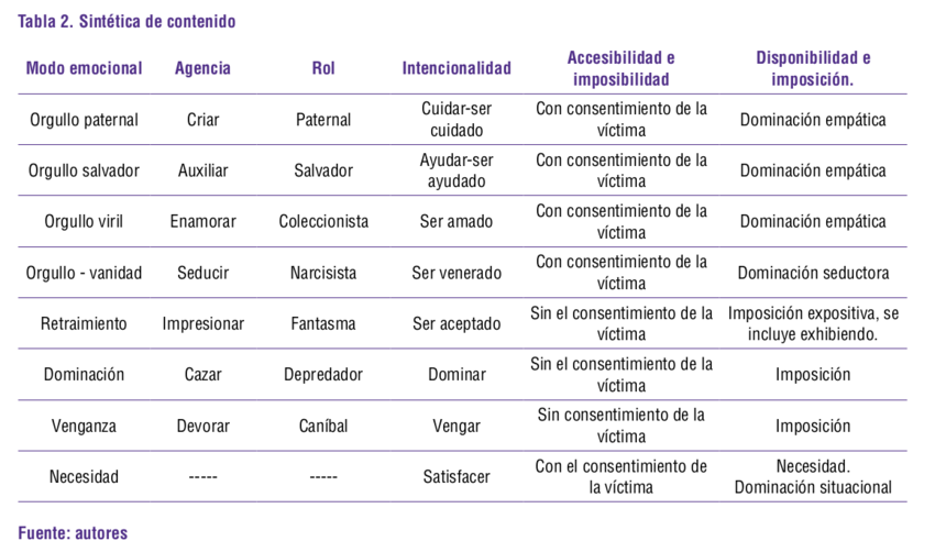 Referidas estas cinco características constitutivas en las emociones encontradas en el delito sexual se encontraron ocho dramas con sus respectivas geometrías; de igual forma, ocho modos emocionales; y ocho conflictos sexualizados, y su correspondiente intencionalidad. Adicionalmente, los dramas presentan diversos mecanismos de accesibilidad y disponibilidad, y los correspondientes procedimientos de imposición y dominación de la víctima. De acuerdo con lo encontrado en la información, estas estructuras poseen varias características constitutivas: son diacrónicas (están constituidas por emociones); presentan polaridades que generan conflictos (son situacionales); y presentan procesos de sexualización. En las siguientes tablas se sintetiza lo hallado (véanse tablas 1 y 2).