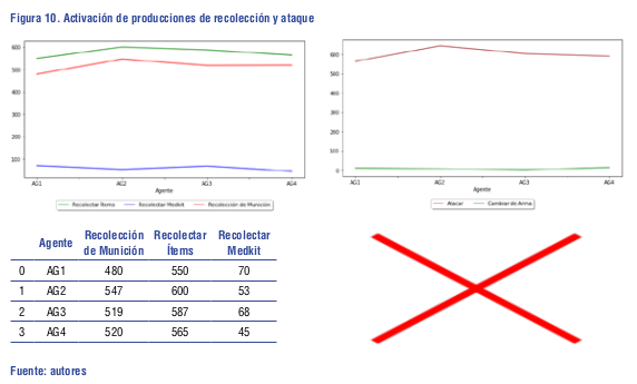 De la recolección se pueden distinguir tres sub-producciones, recoger medkits, munición e ítems; por lo cual, en la figura 10 (superior) se muestra que la recolección se dio dependiendo del estado del agente y que los agentes recogían más municiones e ítems que medkits, esto fue un indicio que las activaciones de las producciones en SOAR no fueron en contrasentido a los parámetros del modelo de conducta que procuran que el agente domine el entorno, algo similar muestra la figura 10 (inferior derecha) en la que el comparativo se hace entre el ataque y las veces en las que los agentes cambiaron de arma, pues al recoger más ítems, el agente asegura no recibir daño mientras la ventana de tiempo de tales ítems esté activa, siendo así necesario el cambio de arma cuando el estado del agente determinaba que el oponente tenía ventaja sobre él.