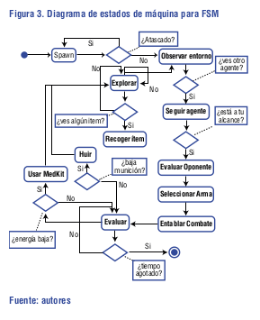 Según Champandard (2003) las técnicas reactivas son deterministas, y esto presume una ventaja al conocer la salida exacta ante cualquier entrada, haciendo que tanto el código y las estructuras de datos puedan ser optimizados por partes, así como la facilidad en el proceso de depuración, pues, ante un fallo, la razón exacta se identifica fácilmente. Así, en la figura 3 se muestra el diagrama de estados que corresponde al curso normal de los eventos considerado en Vélez, Castillo y González (2010) para la FSM que define el comportamiento del agente reactivo.