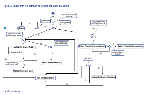 Las acciones son las aplicaciones de las producciones que SOAR determina como procedentes o viables en el momento en que son percibidos los eventos en el entorno, entre las que se encuentran, evadir, vagar, disparar y emboscar. En la figura 4 se muestran las producciones de SOAR y los eventos que las disparan en la memoria de trabajo del agente.