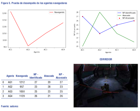En cuanto a la implementación de modelos de comportamiento reactivo basados en las tres operaciones reflejo básicas de los agentes, en lo que tiene que ver con el primer experimento, la figura 5 revela que, mayormente, los agentes se comportaron como estaba determinado en su comportamiento (navegar por el entorno); sin embargo, también se evidencia que el agente demuestra una proporción inversa en la cantidad de registros de puntos de navegación alcanzados en contraposición a cuando éste presenta atascamientos, aunque la proporción de puntos alcanzados y atascamientos ocurre entre un mismo rango de veces.