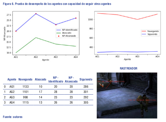 En la sección 2, se describen varias etapas relacionadas con la metodología, iniciando con la elección de plataformas y herramientas de desarrollo para la producción de los modelos conductuales, estableciendo a Pogamut, Java, SOAR y Unreal® como las opcionadas para tal fin; posteriormente, en la segunda etapa, se construyó un módulo que controla la interacción del agente con el entorno, de manera que esta se dé mediante la transmisión de los estados percibidos en el entorno virtual, a la arquitectura cognitiva, y esta, a modo de producciones determine las acciones que serán transmitidas de vuelta al agente para que las lleve a cabo. Luego, la tercera etapa tiene que ver con la experimentación; en ella todos los modelos, tanto los de los agentes que basan su conducta en máquinas de estados finitos como aquellos en los que su actuar obedece a lo determinado por la arquitectura cognitiva, se someten a prueba en un entorno controlado en términos del terreno, ítems y características homogéneas del entorno. En la sección 3, se analizan los resultados obtenidos en la experimentación con los modelos, y, finalmente, en la sección 4 se contemplan conclusiones tanto para los modelos de comportamiento basados en máquinas de estados finitos como para los modelos asistidos por la arquitectura cognitiva.