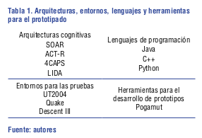 La tabla 1 muestra las alternativas que se compararon y probaron para seleccionar las que se consideraron más apropiadas en cuanto a la integración y compatibilidad del entorno de desarrollo con la plataforma y el motor de la arquitectura cognitiva. Finalmente, se seleccionó SOAR como arquitectura cognitiva, JAVA como lenguaje de programación, UT2004 como entorno para los agentes y POGAMUT para el desarrollo de prototipos de agentes artificiales.