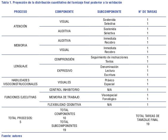 Este instrumento de tamizaje lo compone un conjunto de tareas digitales breves, diseñadas para la medición de los siguientes procesos cognitivos en niños de 6 a 7 años: atención, memoria, lenguaje, habilidad visoconstructiva y funciones ejecutivas. Esta herramienta permite un rastreo del rendimiento de estas habilidades y orienta al profesional para desarrollar un protocolo de evaluación más específico para el niño (Ver figura 1); para su validación, el instrumento contiene 149 ítems en total y para contar con la característica de un instrumento corto (tamizaje), se buscó dejar una tarea por subcomponente de cada proceso cognitivo; posterior al análisis de la validez de contenido y en la conformación del tamizaje final, se propuso dejar 19 ítems (ver Tabla 1). Se aclara que cada tarea, incluye uno o varios ítems y específicamente para la etapa de validación, se pasaron varios ítems opcionales por subcomponente, buscando que los jueces observaran varios estilos. Algunas tareas, también cuentan con niveles de complejidad: Bajo, Medio y Alto.