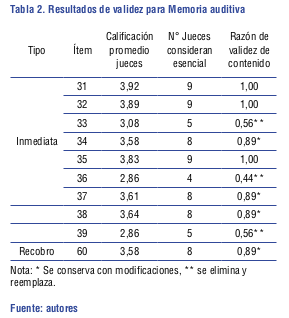 Durante la validación de contenido llevada a cabo por nueve jueces expertos, se pudo evidenciar la diversidad de recomendaciones en cuanto a los criterios de evaluación, frente a la pertinencia, suficiencia, relevancia y redacción. Puntualmente, parte del porcentaje de calificación otorgada por los jueces al componente de la atención, esto es, a los ítems que evalúan la atención auditiva selectiva, está de acuerdo con la pertinencia del ejercicio, pero se evidencia una segunda postura que manifiesta que los ejercicios de esta función están estrechamente ligados con la atención auditiva dividida; estos argumentos se revisarán al detalle ya que pueden estar mediados por la falta de precisión en la instrucción.