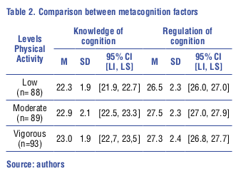 In conclusion, this study indicates that SPA levels have an effect on MC, with moderate and vigorous levels being favorable. Specifically, the vigorous level shows a better score than the low level in knowledge of cognition. Also, moderate and vigorous levels showed a better score than the low level, in the regulation of cognition.