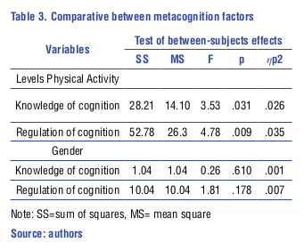 ABSTRACT: Abstract: Background: Cognitive processes are associated with Systematic Physical Activity (SPA). However, few studies have evaluated the relation between SPA and Metacognition (MC). Objectives: (1) to study the effect of the SPA levels on MC, and (2) to explore the covariance of gender. Method: Through a Non-Experimental design and with intentional sampling, 270 university students participated (M age = 25.3, SD= 1.5, min= 18, max= 51), 209 men (77.4%), and 61 women (22.6%). The International Physical Activity QuestionnaireShort Form (IPAQ-SF) and The Metacognitive Awareness Inventory were completed. The MANOVA showed that SPA levels significantly affected MC. The MANCOVA did not show a gender effect. Results: The main effects indicated that moderate and vigorous SPA levels favor MC. Differences were observed between the low vs vigorous SPA levels (p= .035, 95% CI [-1.49, -0.03]) in the knowledge of cognition factor. Similarly, there are differences in the regulation of cognition between low vs moderate SPA levels (p= .013, 95% CI [-1.86, -0.16]), and low vs vigorous (p= .044, 95% CI [-1.72, -0.15]). Conclusions: Moderate and vigorous SPA levels favor CM, mainly the regulation of cognition. In contrast, the vigorous SPA level favors the Knowledge of Cognition.