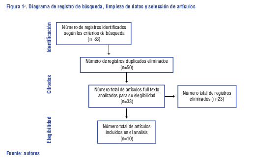 Después de la identificación total de los artículos encontrados en las dos bases de datos seleccionadas, se realizó una revisión de todos los documentos con el fin de encontrar y descartar aquellos artículos que se encontraban duplicados. Posteriormente, se descargaron los 33 artículos aptos para ser elegidos, se revisó en detalle el resumen o abstract de cada uno de estos artículos, corroborando que correspondieran al cambio conceptual en los procesos de aprendizaje de la química. Se revisó también, que el enfoque teórico se abordará dentro del artículo de manera detallada, de modo que se pudiera evidenciar la postura teórica de cambio conceptual asumida en el artículo, de lo contrario, el documento era descartado. Finalmente, de los 33 artículos revisados solo 10 cumplieron con los criterios previamente establecidos.