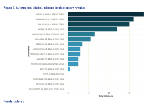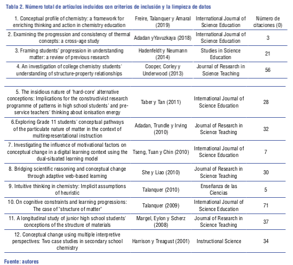 A continuación, presentamos el número total de artículos elegidos para el análisis propuesto. En la tabla 2, se presentan 12 artículos, si bien el número total de artículos elegido eran 10, se incluyen los artículos 11 y 12 por la relevancia que presentan, ya que se relaciona específicamente con el cambio conceptual y aprendizaje de la química. Estos dos artículos presentan una citación superior a 30 (figura 2), por lo tanto, consideramos importante estudiar su contenido y posibles implicaciones de tales artículos dentro de esta línea de investigación. De los 12 artículos, 1 estaba en español, los demás 11 artículos estaban en inglés.