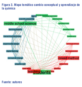 La visualización de los datos se lleva a cabo a través del paquete bibliometrix del software estadístico R, teniendo en cuenta las ventajas que presenta en cuanto a la visualización de los datos tal y como lo exponen Aria y Cuccurullo (2017). Por medio de este software se representan los autores más citados, con relación al estudio del cambio conceptual durante el aprendizaje de la química y las revistas donde se han publicado tales documentos (figura 2). Por otra parte, el mapa temático que se presenta en la figura 3, da cuenta de los enfoques de investigación y los diseños de estos estudios, la población objeto de estudios y algunos de los métodos de enseñanza propuestos por los autores. Consideramos de gran importancia este mapa, ya que oriento el análisis, la síntesis e inferencias realizadas a la lectura detallada de los artículos y sus implicaciones en los procesos de enseñanza y aprendizaje de la química.