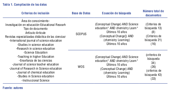 La búsqueda de los artículos, se llevó a cabo en las bases de datos Web of Science y Scopus, empleando la opción de búsqueda avanzada, para el caso de Scopus Titulo-Abstract-Palabras clave y para Web of Science se emplearon las siglas TS = para la búsqueda de los documentos por tópico. Las ecuaciones de búsqueda emplearon el operador boleano AND, así mismo, se utilizaron operadores de truncamiento y caracteres comodín como los paréntesis “()” con el fin de introducir más de dos términos en la misma ecuación, utilizando un operador lógico y el asterisco “*” al final de las palabras con el propósito de encontrar todas las formas posibles. A continuación, se presenta las ecuaciones de búsqueda empleadas (Conceptual Change) AND (chemistry Learning) (Conceptual Change) AND Science education* AND chemistry Learn