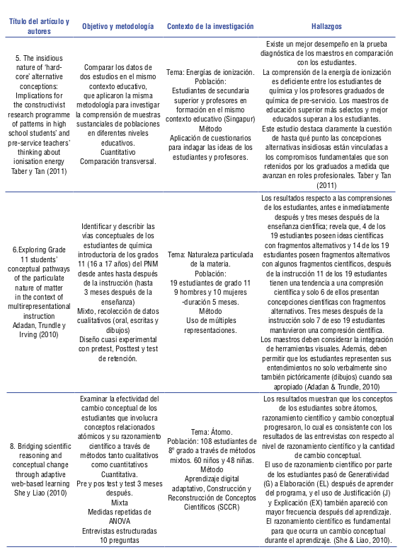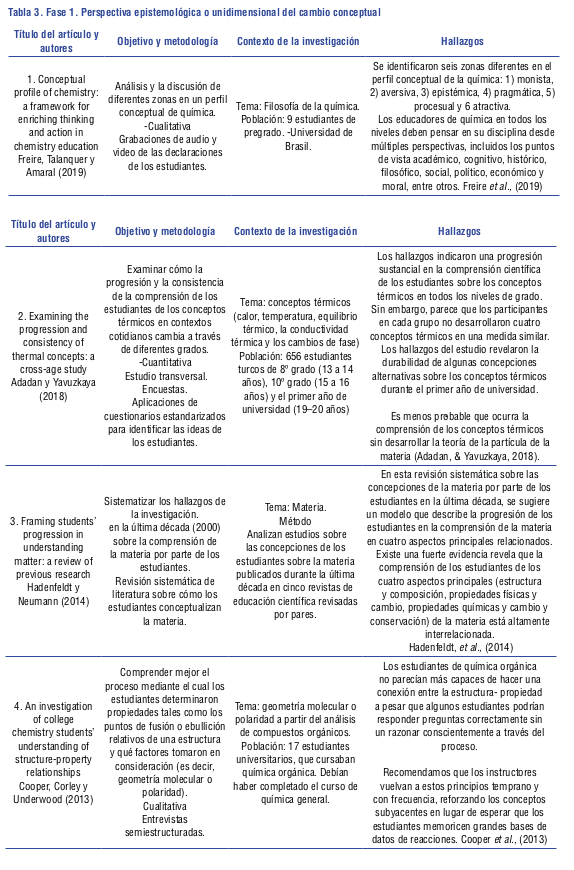 En la tabla 3 se presentan los estudios que fueron seleccionado para el análisis, teniendo en cuenta su objetivo, enfoque de investigación, método, temas de química estudiados, población y principales hallazgos. Esto nos dejó ver las fases indicadas por Amin, Smith y Wiser (2014) o perspectivas teóricas como lo plantea Tamayo (2009) del estudio del cambio conceptual y sus implicaciones para los procesos de aprendizaje de la química.
