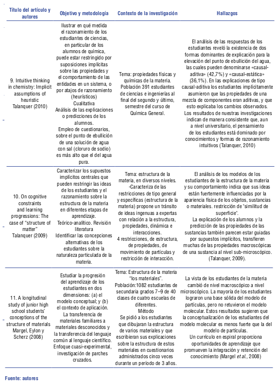 Con relación a los temas de química más estudiados, encontramos el tema de estructura particulada de la materia, donde de los 10 artículos, 5 pesquisas estudian este tema (Hadenfeldt, et al., 2014; Adadan & Trundle, 2010; Talanquer, 2009, 2010; Margel et al., 2008). Para estos autores la importancia del estudio de la naturaleza particulada de la materia, se debe a que, es un concepto nuclear en química, para Adadan y Trundle (2010) “es el concepto más central en el currículo de ciencias en términos de su potencial para proporcionar una base para explicar una variedad de temas en química, como lo enlace químico, el cambio químico, la disolución” (p. 1006). De allí la importancia, de que, los docentes de química, conozcan de primera mano las concepciones alternativas o ideas implícitas de los estudiantes, en el aula de química, con el fin de diseñar escenarios y espacios de aula que propenda por la transformación de estas ideas. Hadenfeldt, et al. (2014) señalan que, para una adecuada compresión de la estructura particulada de la materia, se requiere una interrelación profunda de 4 aspectos principales (estructura y composición, propiedades físicas y cambio, propiedades químicas y cambio y conservación). Por otra parte, los demás temas examinados fueron: conceptos térmicos como; calor, temperatura, equilibrio térmico, la conductividad térmica y los cambios de fase (Adadan & Yavuzkaya, 2018), geometría molecular (Cooper et al., 2013), energía de ionización (Taber & Tan, 2011).