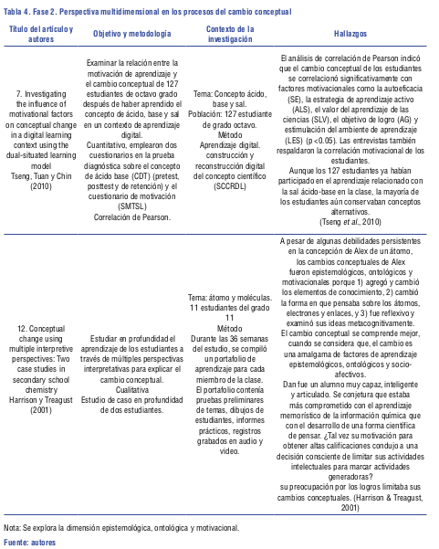 En síntesis, del análisis realizado podemos establecer que se presentan dos grandes tendencias en losestudios del cambio conceptual en el aula de química. En la tendencia multidimensional los autores consideran que el cambio conceptual no puedesolo restringirse a los aspectos cognitivos, pese ala importancia de los estudios unidimensionaleso de naturaleza epistemológica para identificar yrastrear las ideas o concepciones de los estudiantescon relación a los fenómenos científicos. Se propone avanzar en la exploración de la evolución otransformación de estas ideas, desde posturas máscálidas, posturas que reconozcan que las motivaciones, los procesos de autorregulación y las ideaso concepciones sobre la naturaleza de los conceptos o fenómenos estudiados en el aula inciden enla reconstrucción de las ideas iniciales.