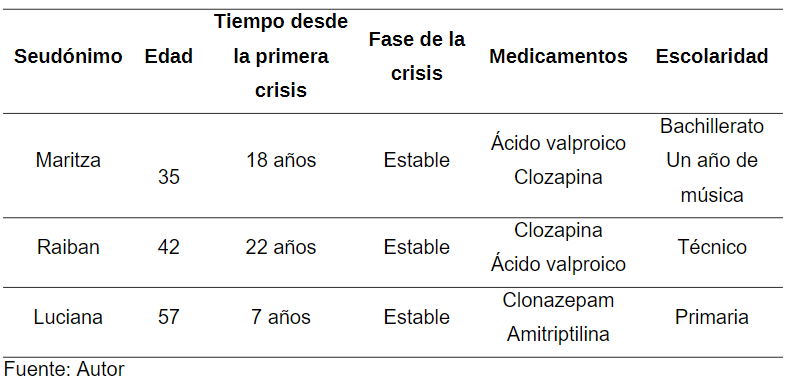 Una vez se aplicaron estos criterios y teniendo en cuenta las sugerencias en cuanto al número ideal de sujetos para un estudio de esta naturaleza (Pietkiewicz & Smith, 2014), se seleccionaron un total de tres participantes; dos mujeres y un hombre, cuyas edades oscilaron entre 35 y 57 años, estos se encontraban siendo atendidos dentro del sistema de salud mental público del Departamento del Atlántico, Colombia. Partiendo de los presupuestos epistemológicos de la investigación cualitativa, este número resultó conveniente ya que, la finalidad no fue generalizar resultados ni generar explicaciones, toda vez que se buscó comprender la realidad de un grupo de personas particulares; lo que si es cierto es que, según las similaridades de la situación y las características de los sujetos, se puede aplicar el principio de la transferibilidad (Flick, 2018).