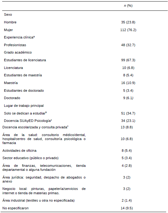 A través de un muestreo no probabilístico, sujeto-tipo y con el uso de la técnica de encuesta, se obtuvo una muestra total de 154 participantes, sin embargo, 7 fueron descartados, debido a que 3 no aceptaron el consentimiento informado y otros 4 no cumplieron con los criterios establecidos. Por lo tanto, la muestra final fue de 147 participantes: 99 estudiantes (n = 77 modalidad a distancia y n = 22 modalidad presencial) y 48 profesores de psicología (n = 35 modalidad a distancia, n = 4 modalidad presencial y n = 9 Mixto). La mayoría de los participantes fueron mujeres (n = 112, 76.2%), su edad promedio fue de 37.88 (SD = 10.59, rango = 18-69) y el promedio de la experiencia clínica de los profesionales fue de 11.15 (SD = 6.48, rango = 2-25). La tabla 1 proporciona información complementaria sobre las características sociodemográficas y profesionales de la muestra.