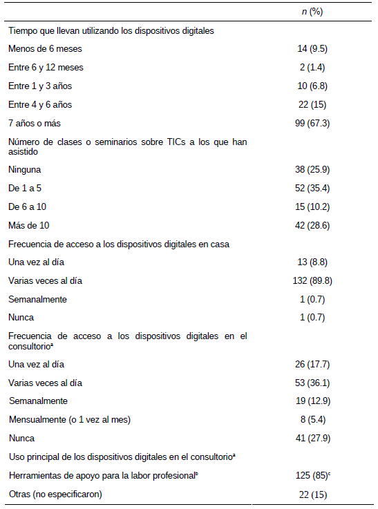 En la tabla 3 se puede observar que la mayoría de los participantes llevan varios años utilizando los dispositivos digitales y han asistido a diversas clases o seminarios sobre las TICs, esto refleja que tienen conocimiento y capacitación sobre el uso de los mismos. Así, acceden con frecuencia (varias veces al día) a las TICs en casa/consultorio. Aunque, la mayoría de los participantes (n = 125, 85%) refirió utilizar estos recursos digitales como herramientas de apoyo (actividades complementarias) para la labor profesional en la práctica clínica, tales como; agendar citas, escribir notas de los casos clínicos, revisar y enviar correos electrónicos a los pacientes, llevar expedientes clínicos, aplicar y obtener resultados de las evaluaciones. No obstante, solo un bajo porcentaje (n = 13, 8.8%) de este número de participantes (n = 125, 85%) señaló utilizar estos recursos como herramienta principal con el paciente (Ej. generar adherencia y relación terapéutica). Aunado, otro grupo de participantes (n = 22, 15%) utiliza los dispositivos digitales para otras actividades diferentes (no especificadas).