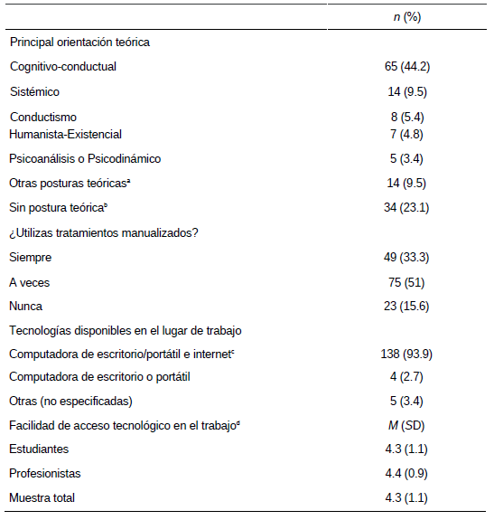 En la tabla 4 se puede observar que la mayoría de los participantes tienen una orientación teórica Cognitivo Conductual (n = 65, 44.2%) y utilizan intervenciones manualizadas “a veces” (n = 75, 51%) o “siempre” (n = 49, 33.3%). Asimismo, el total de los participantes ha mostrado una gran facilidad de acceso a la tecnología en el trabajo (M = 4.3, SD = 1.1), siendo la “computadora de escritorio/portátil e internet” a quienes la mayoría tiene acceso (n = 138, 93.9%) aunque, en menor medida otro porcentaje considerable (n = 130, 88.4%) tiene acceso a otras tecnologías comunes (Ej. lector de libros, tabletas, equipos de audio y video, webcam, pantallas, software multimedia digital, etc.).