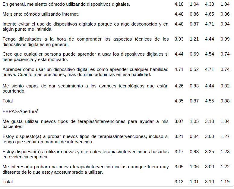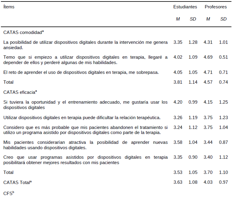 En la tabla 5 se identifica que los participantes están muy familiarizados con el uso de los dispositivos digitales (CFS), siendo los profesionales (M = 4.6, SD = 0.9) quienes mostraron ligeramente mayor comodidad y familiaridad con las tecnologías en comparación con los estudiantes (M = 4.4, SD = 0.9). Así también, los profesores (M = 4.0, SD = 1.1) son quienes mostraron actitudes más positivas sobre las intervenciones digitales (CATAS) que los estudiantes (M = 3.6, SD = 1.1), tanto en la percepción de comodidad y de eficacia. Aunado, los estudiantes (M=3.13, SD = 1.01) y profesores (M = 3.10, SD = 1.19) mostraron actitudes de neutralidad ante la disposición para utilizar nuevos tratamientos psicológicos (EBPAS/Apertura), especialmente, aquellos tratamientos basados en evidencia empírica.